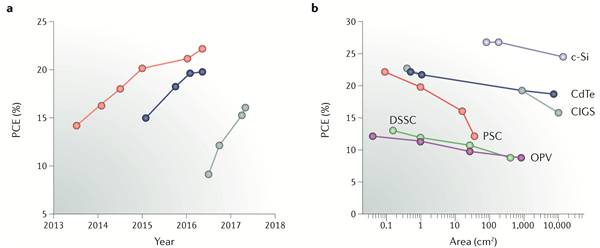 图1 钙钛矿太阳能电池的效率图:(a) 近几年钙钛矿电池的功率转换效率图;(b) 不同电池的功率转换效率图。