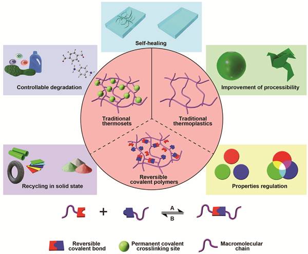 可逆的共价键聚合物能够改变它们的价态排列和结构,但仍可以获得改变后的稳定结构。虽然人们研究了很多可逆共价键聚合物新材料的合成,但是还没有克服永久共价键聚合物的劣势,也没有带来新的应用潜力。目前,许多新技术已经投入到聚合物的制备过程中,例如:性能调整、自修复、再加工、固态再生和控制降解等方法,这为提升传统的聚合物制备工艺提供了更多可能。虽然目前的研究仍属于初期阶段,但是对于大规模的应用仍具有很强的推动作用。文中总结了这种发展的现状,遵循自下而上的策略,充分考虑了理论和实验的研究成果。近日,中山大学 的章明秋 和容敏智(通讯作者) 等人,总结了可逆共价键的聚合物新材料的合成与性能的研究进展。其内容主要包含四个方面:(1)可逆共价键的化学基础;(2)可逆共价键聚合物的流变性;(3)可逆共价键聚合物的合成方法;(4)可逆共价键的化学的智能自适应特性。虽然聚合物中含有可逆共价键的优势和劣势在文中得到了充分的分析,但是可逆共价键化学的平衡控制仍具有很多挑战和机会。