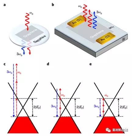 当高强度光(超过 1010 W·m-2)与非线性材料相互作用时会发生光谐波产生。通过对非线性光学响应的电控制能够实现门控可调开关和变频器等应用。石墨烯显示出了非常强的光-物质相互作用以及宽带可电调谐的三阶非线性极化率。Sovai 等人表明,通过控制费米能量和入射光子能量,石墨烯中的三次谐波产生效率可以增加接近两个数量级。这种增强是来源于共振多光子跃迁引起的非线性电导率虚部中的对数共振。无质量狄拉克费米子的线性色散使得能够在超宽带上实现可门控的三次谐波增强,从而为光通信和信号处理应用中的宽带可电调变频器铺平了道路。(Nature Nanotechnology DOI: 10.1038/s41565-018-0145-8)