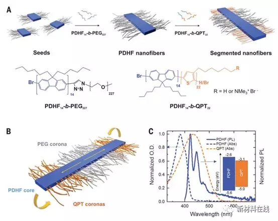能够以超过 100 纳米的长度尺度进行激子传输且易于加工的材料,正是一系列采光和光电子器件的理想材料。Jin 等人介绍了包含结晶聚(二正己基芴)核心和由聚乙二醇组成的溶剂化的分段电晕的有机半导体纳米纤维的制备,分段电晕由中心聚乙烯二醇和末端聚噻吩组成。这些纳米纤维在末端嵌段中显示出从核心到较低能量聚噻吩的激子转移,该过程发生在链间 p-p 堆叠的方向上,并具有非常长的扩散长度(超过 200 纳米)和较大的扩散系数(0.5 cm2/s)。这一结果是由有序的结晶纳米纤维核心所产生的均匀激子能量景观所实现的。(Science DOI: 10.1126/science.aar8104)